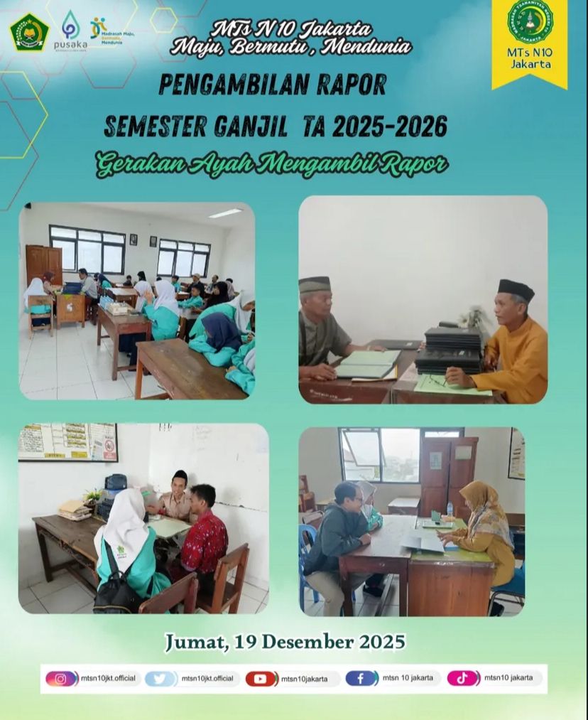 Jakarta — MTsN 10 Jakarta melaksanakan program GEMAR (Gerakan Ayah Mengambil Rapor Anak ke Sekolah) pada Jumat, 19 Desember 2025. Kegiatan ini bertujuan meningkatkan keterlibatan ayah dalam proses pendidikan serta memperkuat sinergi antara madrasah dan keluarga.